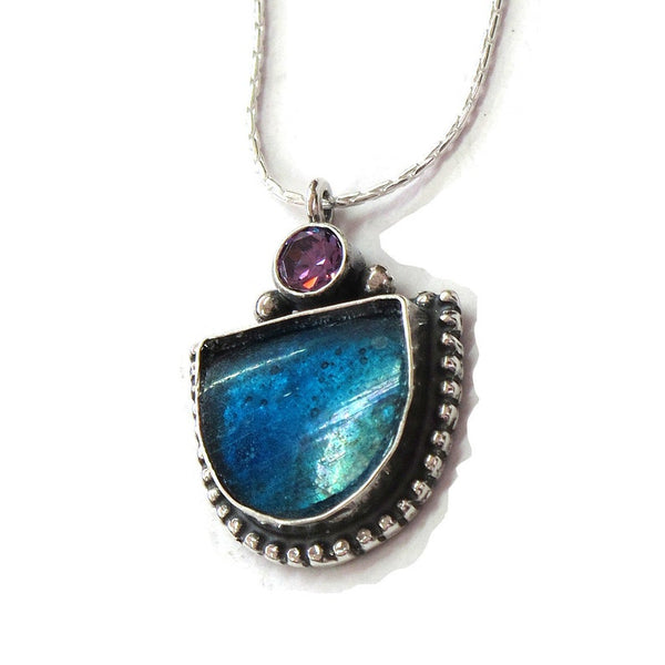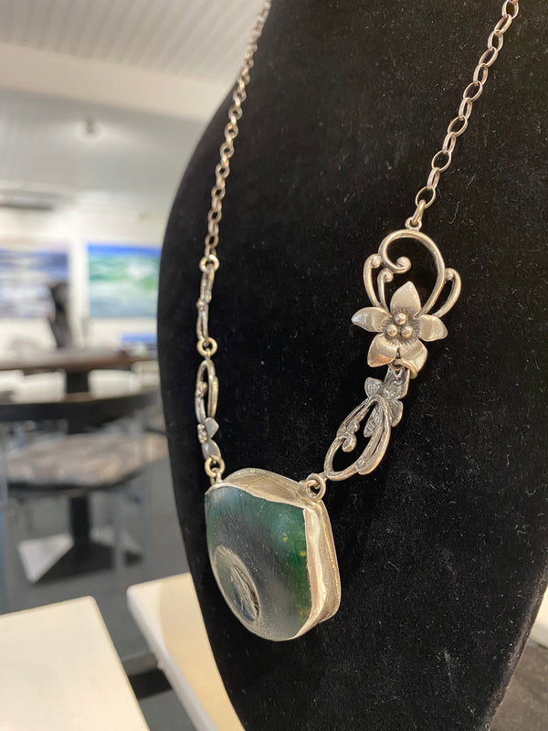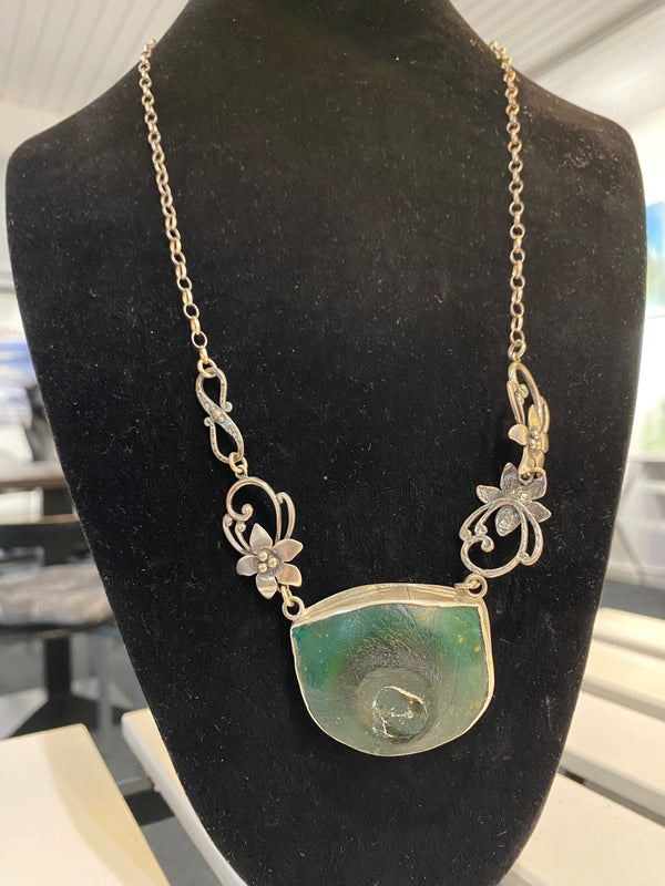 På udsalgUnika halssmykke med romersk glas og sølvblomster i Art nouveau stil