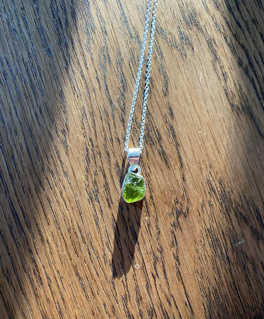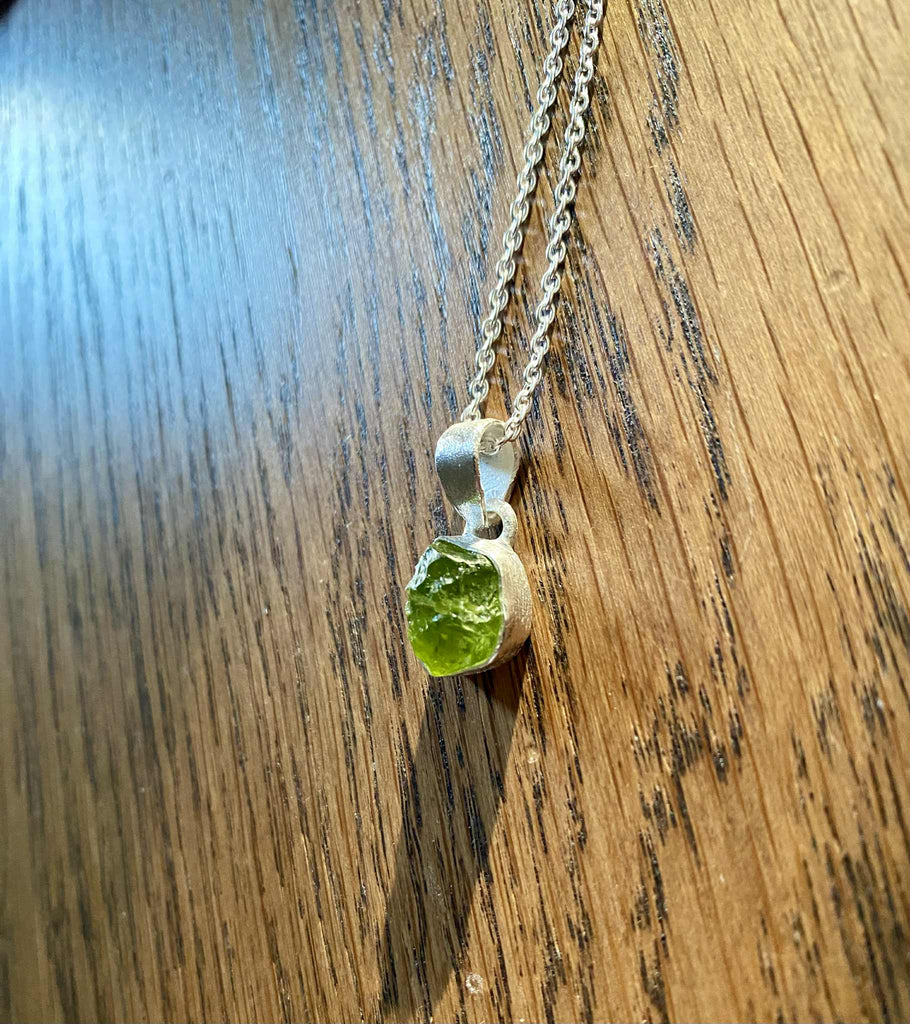 Den rå Peridot sten er i en smuk grøn farve og er ikke 100% forarbejdet. Det giver et mere råt udtryk, at stenen er mere "original" - og to halskæder er aldrig helt ens.